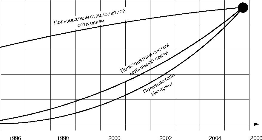 Точно в такой же ситуации спустя пять веков оказалась и традиционная телефония. Представленная в верхней части рис.2 кривая роста числа телефонных абонентов вполне впечатляет сама по себе, но впечатление это умаляют только что описанным способом кривые роста пользователей мобильных сетей связи и Интернет. Именно в этих кривых, по глубокому убеждению автора, и заключается суть конвергенции сетей и услуг связи.